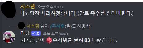 - '마냥' 봇은 외부 봇이기에 주사위를 제외한 다른 기능은 총괄도 조작 불가능합니다.